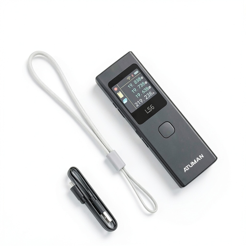 The ATuMan LS6 Laser Distance Meter is a high-precision tool designed for accurate distance measurements up to 131 feet with an impressive accuracy of +/- 1/16 inch. Constructed from durable aluminum, it features a compact design measuring 5.04 x 2.76 x 0.75 inches and weighing just 0.1 kilograms. This device combines laser projection, distance measurement, and angle detection in a versatile 3-in-1 system, offering 19 measurement functions such as area, volume, continuous measurement, and Pythagorean theorem calculations. It includes a rechargeable 300mAh lithium battery, a TFT color display for clear data visualization, and stores up to 20 data sets with unit and language switching capabilities. The package includes the laser meter, charging cable, lanyard, and user manual, all backed by a 2-year manufacturer warranty and recognized with the iF DESIGN AWARD 2024 for its innovative design.