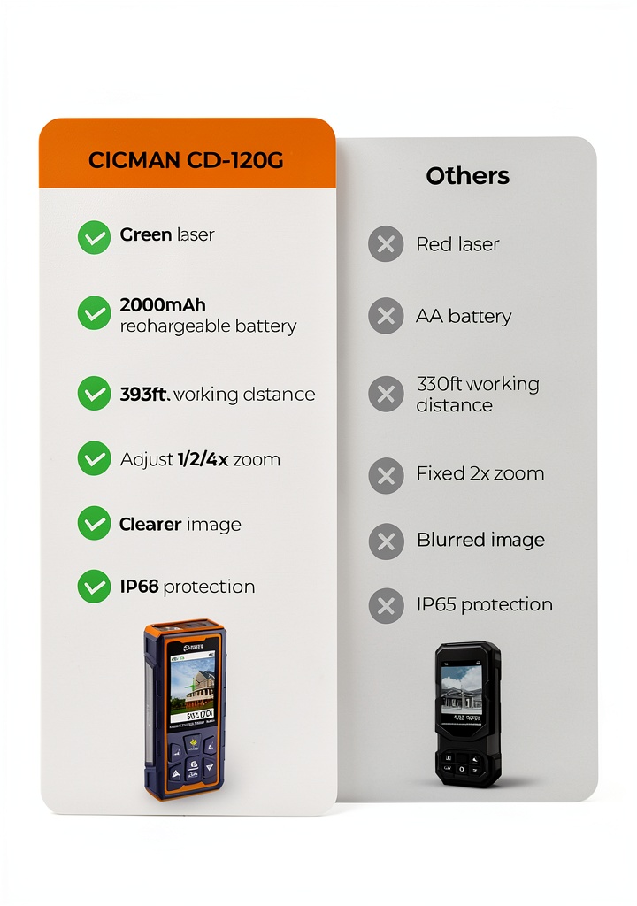 CIGMAN stands out with its focus on innovation and quality, incorporating a 360° high-precision tilt sensor and P2P technology for remote measurements between any two points. The product’s competitive advantages include superior shock absorption from the ABS-wrapped body, long-lasting battery life, and an intuitive rotatable display for easy reading from any angle. Backed by a 3-year warranty, it offers reliability and customer support, while the green laser technology provides better visibility compared to standard red lasers, ensuring accurate results in diverse scenarios.