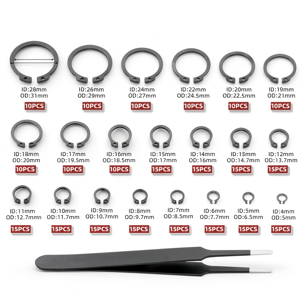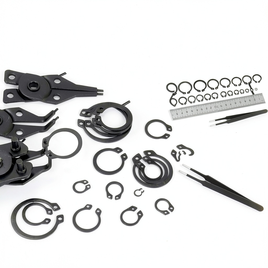 These external retaining rings are ideal for axial slots in a wide range of machinery and equipment, including automotive systems, valves, electrical appliances, clock movements, doors, windows, and industrial machinery. They serve to secure components axially, reducing clearance and enhancing stability in dynamic environments. Target users include mechanics, engineers, and DIY enthusiasts working on repairs, maintenance, or assembly projects that require reliable fastening solutions. The rings are suitable for both professional workshops and home garages, providing versatile support in harsh conditions without compromising integrity.