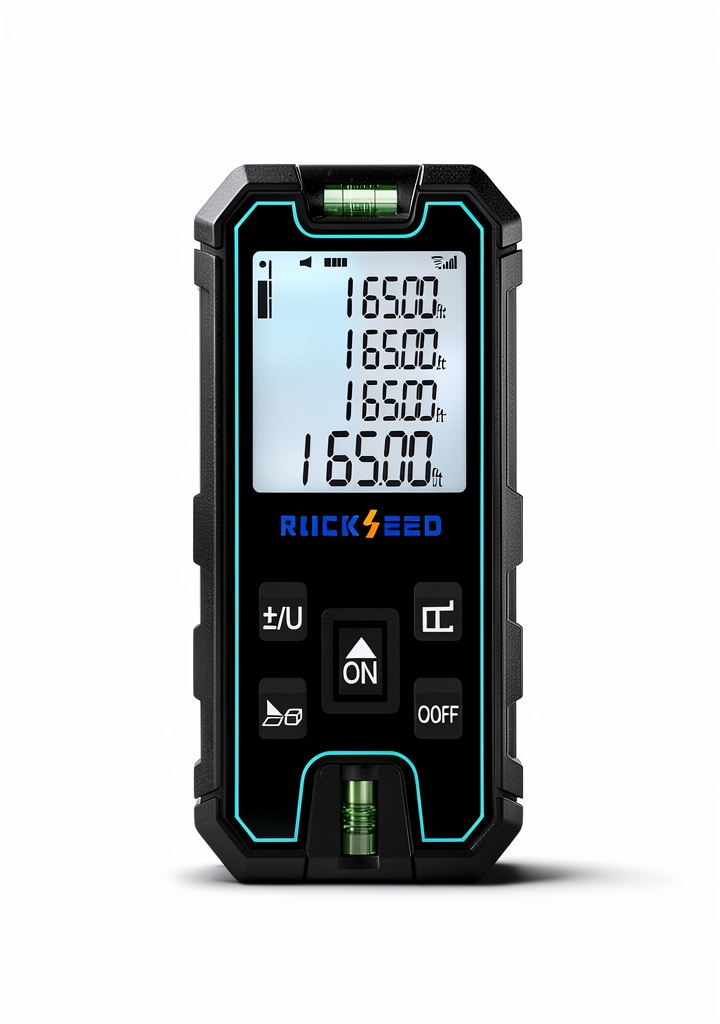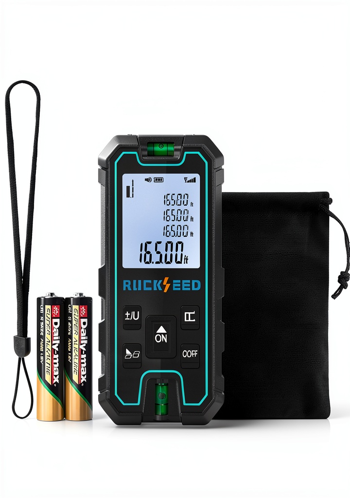 The RockSeed S7-BT laser distance meter is a professional-grade tool designed for accurate and rapid measurements up to 50.29 meters (165 feet). Constructed from durable Acrylonitrile Butadiene Styrene (ABS), this blue-colored device features dual bubble levels for enhanced leveling precision and utilizes advanced laser technology with an accuracy of ±1/16 inch. It operates on 1.5V AAA alkaline batteries (included) and weighs only 150 grams, making it highly portable. The package includes a laser measure, cloth bag, wrist strap, user manual, and packaging box, all backed by a 1-year warranty from the manufacturer.