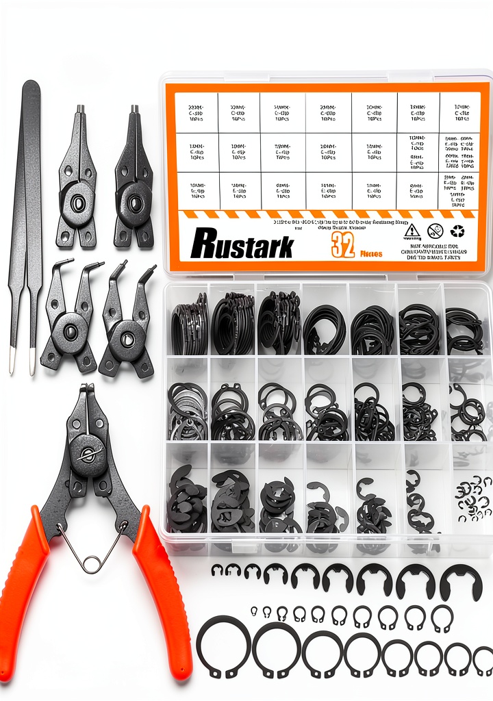 The Rustark Snap Ring Assortment Kit is a comprehensive set designed for professionals and DIY enthusiasts working with mechanical assemblies. It includes 312 pieces of external snap rings, comprising 210 C-clips and 100 E-clips, all crafted from heat-treated black alloy steel for superior corrosion resistance and strength. The kit features 21 different sizes to accommodate various shaft and bore dimensions, ensuring versatility across applications. Each component is precision-engineered to meet industrial standards, with a lightweight design weighing just 7.04 ounces and compact dimensions of 4.96 x 2.55 x 0.86 inches for easy storage. The set also comes with a 4-in-1 snap ring plier with interchangeable jaws (90-degree and 45-degree bends) and tweezers, facilitating quick installation and removal of rings without damaging parts.